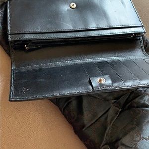 Black Leather Gucci wallet with 6 card slots, 4 bill compartments, a zip pocket, and 1 pocket on the outside.