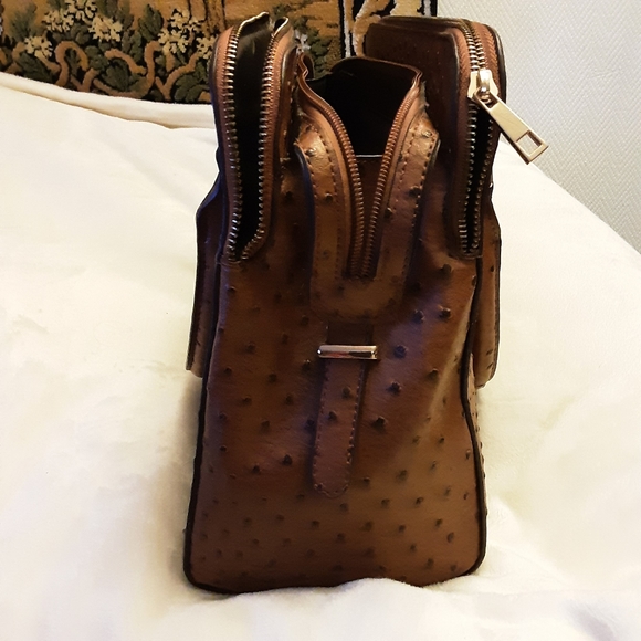 Faux ostrich handbag w matching wallet, 3 zippered compartments,inside pockets in center compartment, outside back pocket, 13 w x 11 h x 5; wallet has multi compartments & side zippered pocket. Gold hardware NWOT