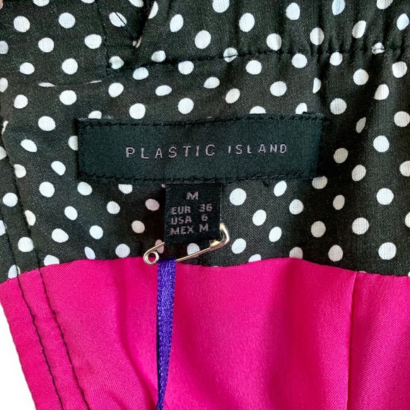 Mid-open back with contrasting brass zipper and tiered ruffle hemline. Made from polyester with 3% spandex. Hot pink lining. Cotton trim.Made in USA