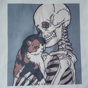 Features a skeleton hugging its sweet cat 🐈