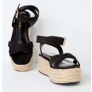 Lulu's Cobi Black Suede Espadrille Platform Sandals. Soft, vegan suede forms a crossing toe band and matching quarter strap with adjustable, silver buckle. Braided raffia amps up the beachy vibe along the heel and 1.5" toe-platform.
