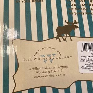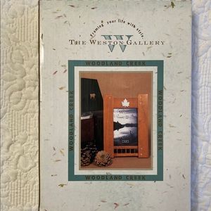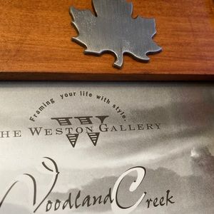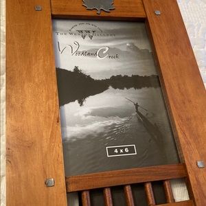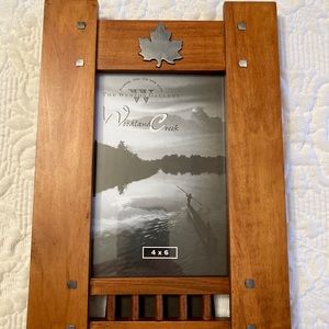 This rustic yet contemporary picture frame is new in the box. It is made by Weston Gallery. It is Honey Oak with a pewter maple leaf. The subtitle is ‘Woodland Creek.’ The frame measures 9 1/2” tall and 7” wide. It holds a 4 x 6 photo. 🚭