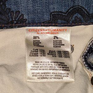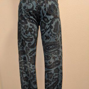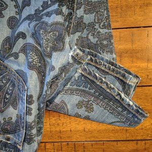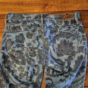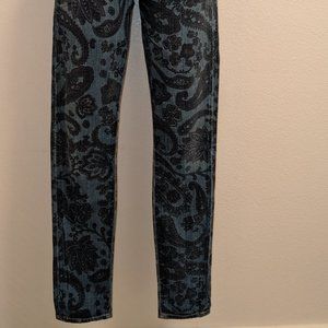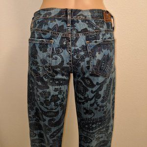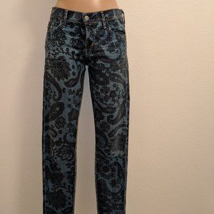 Avedon Low Rise Skinny Jean from Citizens of Humanity in a beautiful paisley pattern (blue, green & purple) in women's size 28. 5 pockets. These are worn and show some signs of distress along back pockets and bottom hems. Please see photos for details.