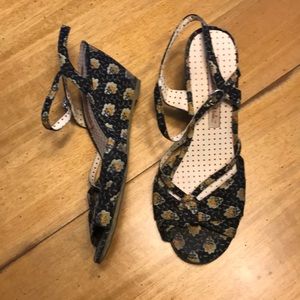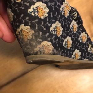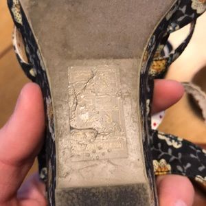 3” wedge, a little dirty in parts (pictured) but looks like it can come out with some scrubbing, black (almost looks like it could be a very dark navy but I think that’s because of the silver accents)