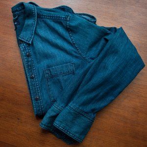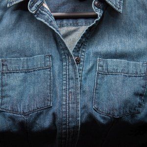 Women's denim long-sleeve, button down shirt - fitted. Quality stitching, the denim is on the darker side, Indigo (currently this shirt is sold in this color but with white buttons only) Collared, two breast pockets, double button closure on sleeve. Worn; nice shirt and timeless in style - sadly doesn't fit me anymore.