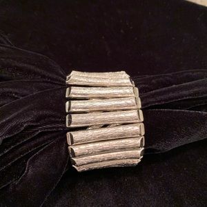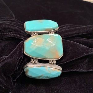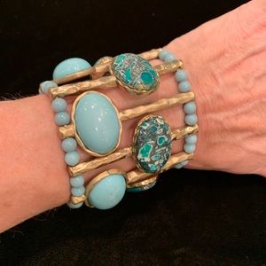 Costume jewelry, 2 - 3 inches wide, metal, elastic and faux turquoise-it is not stone. The 3rd picture is 3” wide and has gold tone accents.