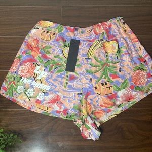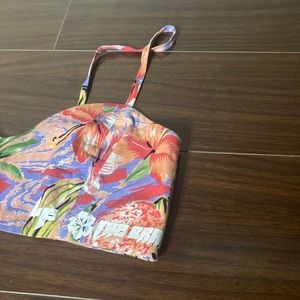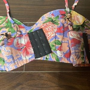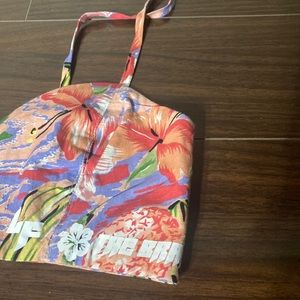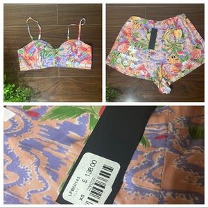 Comes with top and shorts. Top has adjustable straps. Shorts zip on the side. Never worn before.