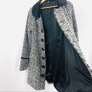 ✨SOLD on other platform✨Stunning Free People black and white knit pattern tapestry coat with contrast velvet collar, large velvet buttons and sleeve trim. Boho western vibes. Fully lined. Wool blend material. 3 front hand pockets. running down front. Bohemian, hobo chic style. Size 8. Black, gray, white color way. See photos for additional information.