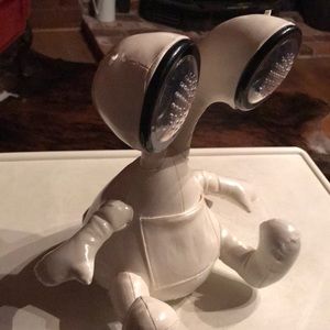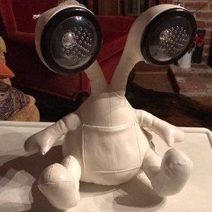 This adorable Alien works great when you plug into your own music device and into Alien! His big eyes are speakers! His cord was missing so I’m including a brand new one! Battery housing lid is missing.