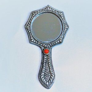 NWT Metal carved hand mirrors and silver carved box. Beautiful metal hand mirrors in red & turquoise beads with antique silver finish. Box is also carved in hard plastic , interior of box is mirror finish.