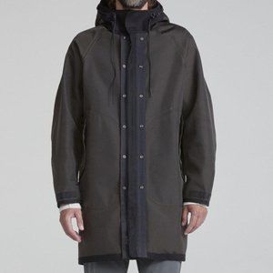RARE limited double use reversible waterproof parka engineered with 3D Dryguard technology. Slim fit, full length parka with a high/low hem, sleeves articulated forward for movement. Rubberized reversible eyelets, Riri zipper and Prym snap closures at CF, reflective leather logo washers under snaps, aqua guard waterproof zippers at side A pockets