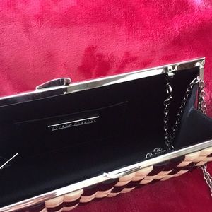 Black and cream checkerboard design bag made up of square tiles. Silver chain inside.