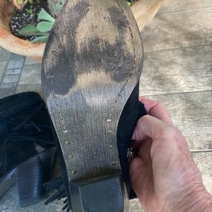 Adorable ankle boots with fringe. Zips on the side. The stacked heel measures approx 2”. The only wear is on the soles. The suede and uppers are in perfect condition. Enjoy these with jeans or skirts.
