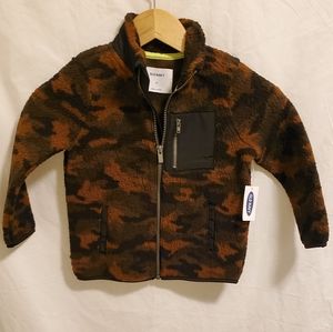 Super-soft, cozy sherpa, with contrasting jersey trim at collar, zipper guard, and pocket openings.