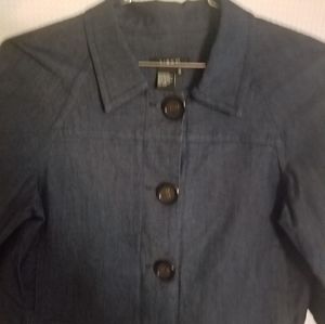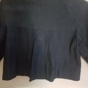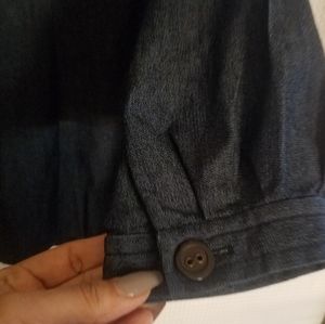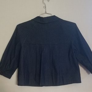 3 button up jean Jacket has a pocket on each side this is in excellent used like new condition indigo blue color has collar and measurements are 19 inches sleeves that have band at the bottom with one button on sleeves 21 inches armpit to armpit 21 inches long not real heavy but still nice comfortable body to it has cute pleats on back