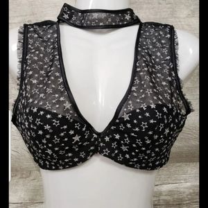 Black Extremely Sexy Bra/rave top with silver stars embroidered all over the front. Mesh front with lined cups to cover and mesh see thru back. Back has double closure, one for behind the neck and one for your back. Has a built in choker and would look great as a Rave Top to!