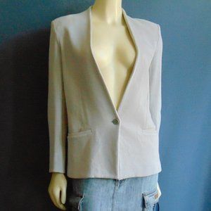 Helmut Lang collarless jacket in a size medium. Beige with a hint of gray. One button closure. Light padding at shoulders. 92% viscose & 8% spandex. Lining is 95% polyester & 5% spandex. Dry clean. Great condition. Comes from a smoke-free home.