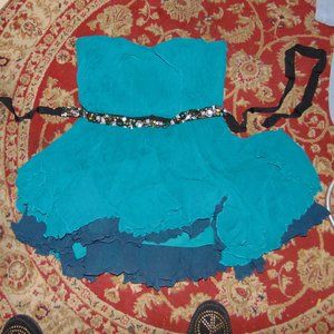 With layers of green in the skirt, this is a very pretty, strapless dress with rhinestone belt attached at the waist. The fabric is very soft and flowy. Boby of the dress is 100% silk and the lining is polyester. Tag says size 10 but please follow the measurements below