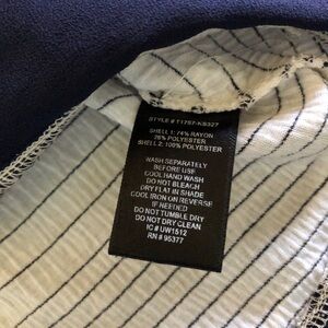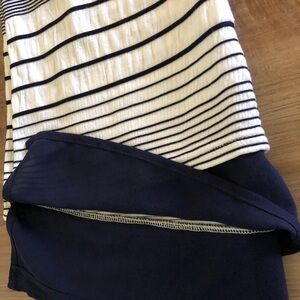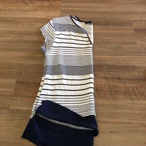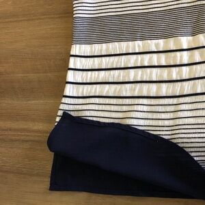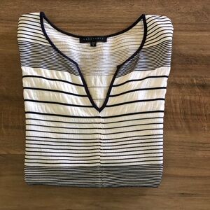 Beautiful striped navy blue and white horizontal striped. V-neck with cap sleeves. Navy stripes are slightly raised on the top. Semi Sheer navy hem with slits on each side. Size Small.
