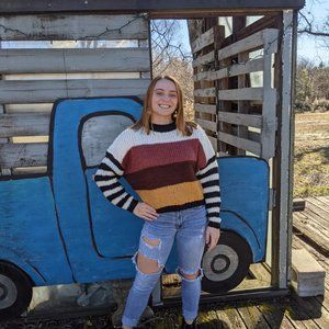 Models are wearing a Medium and Small. This sweater is true to size so your usual size will fit. This has a shorter length and hit just above the waist line for us.