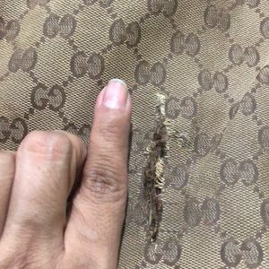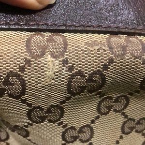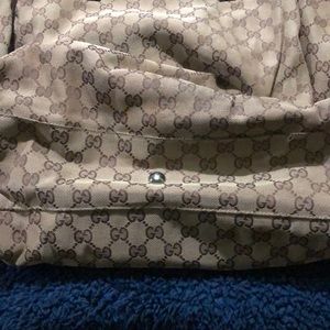 Gucci tote. This is signature style G’s. The handbag is is brown. The inside is clean with very minimal wear. The out side and leather trim do show signs of wear. The bag shows a tear and could be fixed.