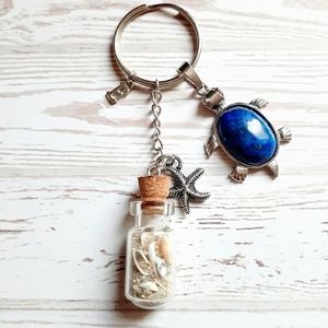 Handcrafted keychain with silver letter "E" charm, Lapis Lazuli turtle gemstone charm, and beach glass bottle charm with sand, real seashells, and silver starfish charm! Perfect for gifts!