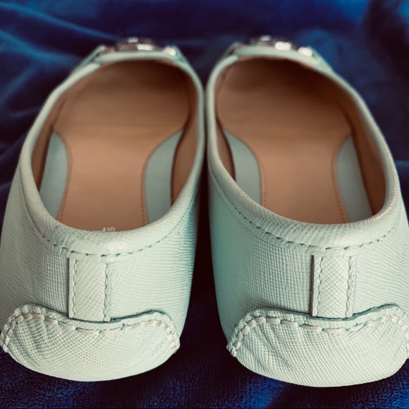 Michael Kors Fulton Moc flats in celadon (mint green) with MK signature emblem on toes. Light scuffing just above heels as shown, especially right; not visible when wearing. Otherwise good condition. This style or this particular shoe in the style runs a bit wide. Please see all photos.