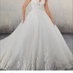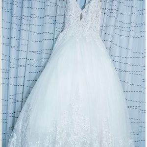 ~The Surim wedding dress is in mint condition. Clean and looks brand new, worn for my wedding in December 2020. It is fully equipped with a wide scalloped hemline and lace trimmed beautiful cathedral length train. It features a beaded alençon lace on a sculptured v-neck bodice.The dress was purchased from Brides of America. It can be altered to fit up or down. The vail is also included with the purchase of the dress.