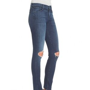 Fitted from the hip to the ankle, these streamlined skinny jeans are made from supremely soft denim cast in a wear-with-anything medium-indigo wash. The versatile pair is accented with shredded split knees for a lived-in finish.