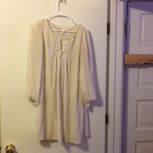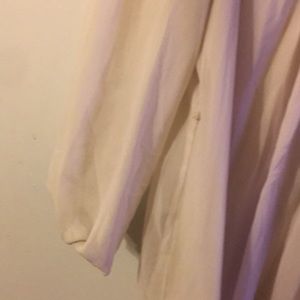 I wore as long shirt with leggings because I’m tall but think it’s uploaded to be a dress :) solid body with sheer long sleeves. Button up closure (small fraying in bottom button). Xhiliration size large. Smoke free environment. Reasonable offers considered