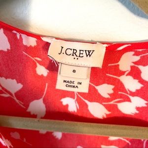 New without tags, Size 8. J.Crew wrap dress. Color is red-orange, with white flowers. Has hidden button on the right and a tie on the left to hold dress closed, also has clasp to adjust cleavage shown.