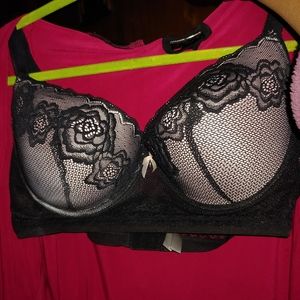 Daisy Fuenyes, lightly padded, beautiful mesh with flower designs on the layer covering the cups under wire bra. Black mesh and pale pinkish/cream color base bra. Not my size. NWOT