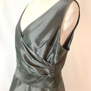 In excellent preowned condition. Dark gray color with a sheen. Sleeveless, vneck neckline. Cross wrap at front. Zipper back enclosure. No size label. Looks to be a size 8 or 10.