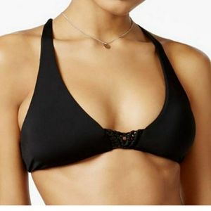 Over-the-shoulder straps cross and tie at center back. Wide V-neckline with braided detail at center.