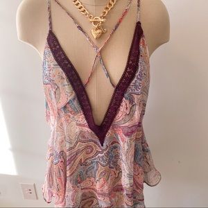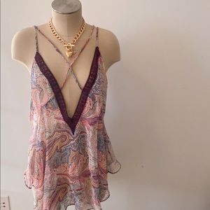 Victoria’s secret multicolor paisley print chemise, with crossover adjustables straps and plunging back and front necklines. In perfect condition, no flaws. Burgundy lace trim and ruffled bottom.