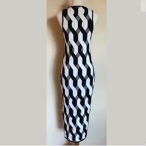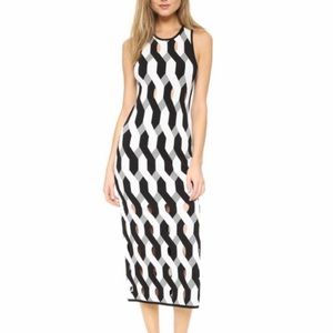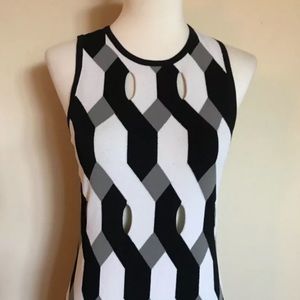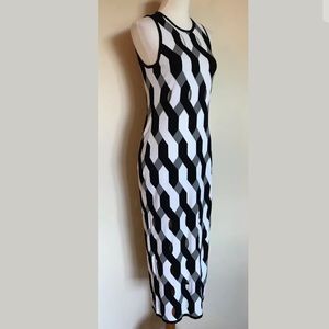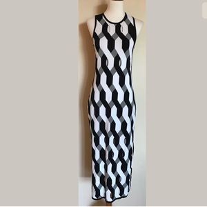 Slim Fit Sleeveless Dress In All-Over Geometric Novelty Stitch. Viscose polyester blend. Fine gauge novelty stitch. 75% Viscose. 25% Polyester.