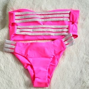 New Pink Silver Back Band Bandeau Top Ruched Back Bikini Set Swimsuit