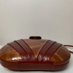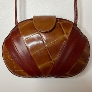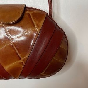 Gorgeous genuine leather vintage brown and tan bohemian glam box bag with a long thin brown leather strap and a flap that snaps in the front. This is so 70’s and so unique and fun! It’s made by Bonavi and is from the 1970’s.