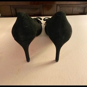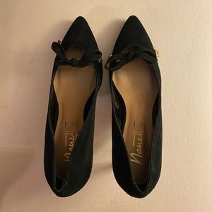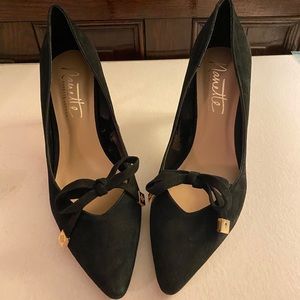 Classy Black Suede Nanette by Nanette Lepore Skylar Pumps with gold-tone hardware. Lightly padded insole. German leather outsole. 3in heel.