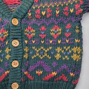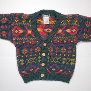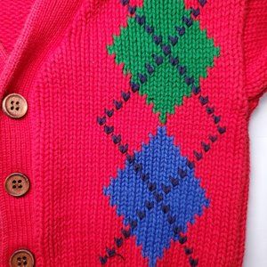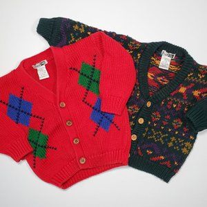 ⚡ Vintage 1990's Baby GAP cardigan knit sweater lot / bundle of two (2) pieces. Two grandpa style button up long sleeve cardigans both size 12-18M. One is bright red with a geo argyle pattern in blue, green, and black. Second is a rainbow Aztec tribal fair isle pattern in forest green with pops of red, orange, purple, and blue. ⚡