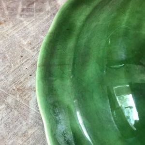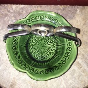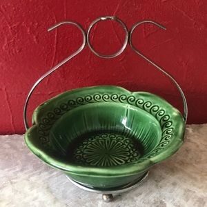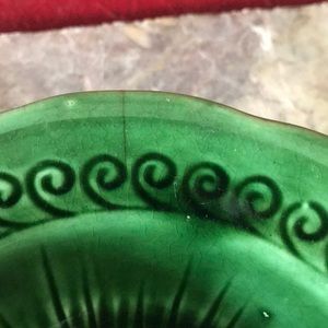 Vintage McCoy GREEN Flower Shaped Bowl with Swirl design on the inside. This footed bowl would make a great catch all for your keys, rings or trinkets. No cracks or chips. Measures approximately 6” in diameter and 2 1/2” in height.