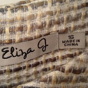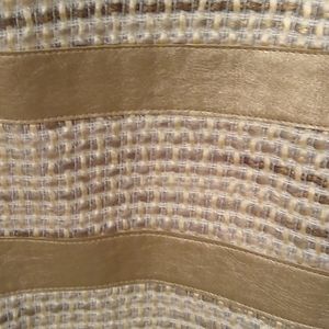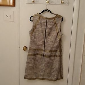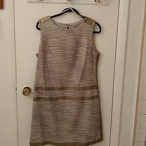 Tweed dress with taupe faux leather detailing along shoulders hem back and sides