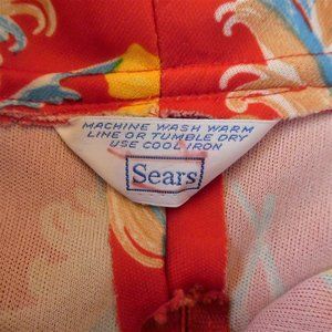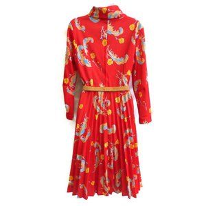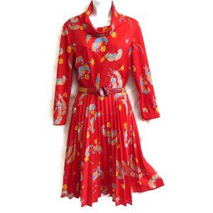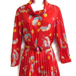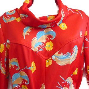 Vintage 60s 70s Sears Shirt Dress. Cowl Neck. Pleated Skirt. Front Western Peaked Yoke. Long Sleeves with Dart Back Elbow. Belt with Toggle Closure. Back Center Zipper. Red with Floral Feather Plumes Design. Wrinkle Resistant. Machine Wash. Measures Modern US Size Medium to Large.