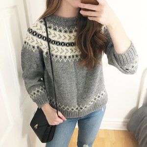 Stunning Vintage Fair Isle Knit Crew Neck Sweater. Very high-quality. Beautiful details around the collar, wrists, and hem. Grey & white pattern. Super thick & cozy for those cold winter days:) Great condition!