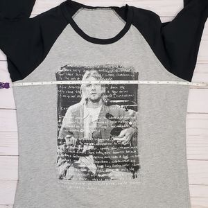 Kurt Cobain fans, this shirt is so unique! Kurts handwriting all over the front over his photo. Baseball style tee with 3/4 length sleeves. Unfortunately the size and materials tags are missing but this fits like a medium. There is one tiny hole at the neckline but wouldn't be seen with a flannel over it.