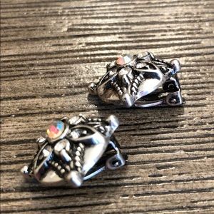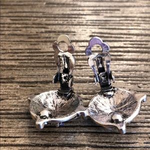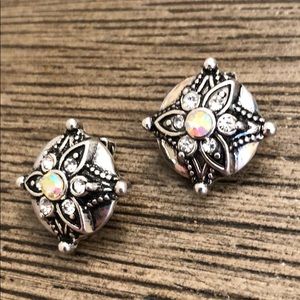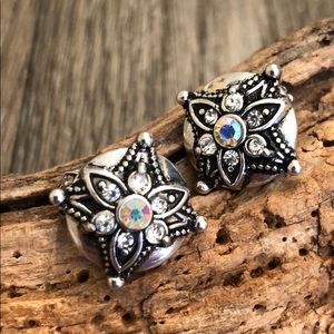 Vintage clip earrings. These have a round shape. These are silvertone with antiquing. Flower in the center with cut glass clear rhinestones and a center Aurora borealis stone. All rhinestones are cut glass. No missing stones. See pictures next to ruler to get an idea of size.