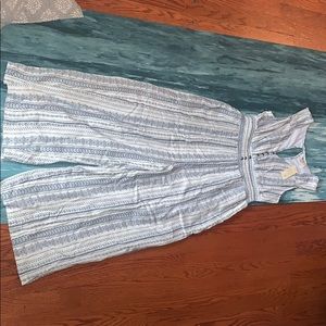 Blue and white romper dress goes down to a little above the ankles. Super cute and comfy. Cute metal fake buttons on the front and one on the neck to close to top of the dress.
