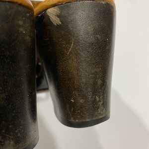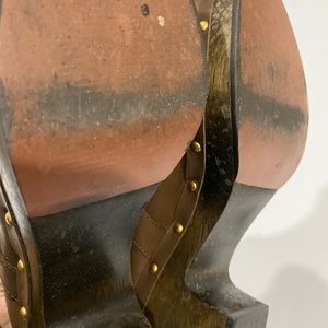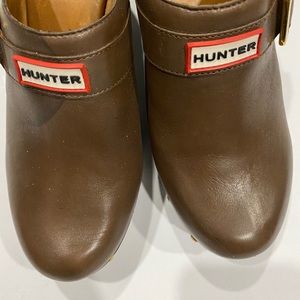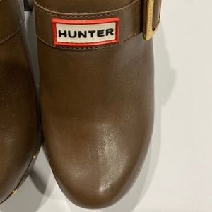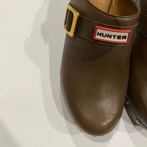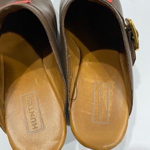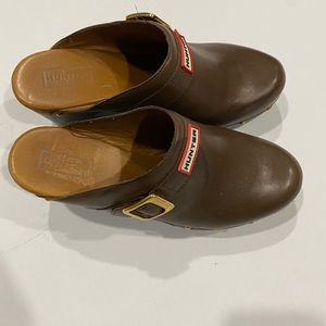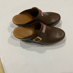 Hunter Serrana Cognac Leather slip on wooden clogs size 6, water spot on right clog, some scuff marks on heel, other wise, good condition. No rips or tears in leather, heel can be polished or cleaned