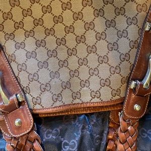 Gorgeous popular & classic Gucci Beige/Brown GG Canvas Medium Pelham Shoulder Bag features brown braided leather handles & goldtone horsebit hardware.