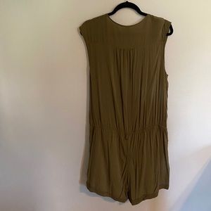 Flowy army green romper with deep v-neck.